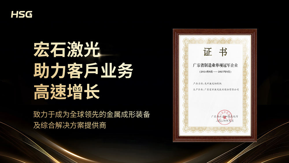 宏石激光自2006始創(chuàng)至今,已榮獲國家高新技術(shù)企業(yè)、國家知識產(chǎn)權(quán)優(yōu)勢企業(yè)獎、行業(yè)創(chuàng)新大獎等多項國家和行業(yè)榮譽。此次獲評“廣東省制造業(yè)單項冠軍企業(yè)”,是對宏石激光堅實技術(shù)實力、良好產(chǎn)品品質(zhì)與強勁市場競爭力的高度認(rèn)可。宏石激光堅持以助力客戶業(yè)務(wù)高速增長為品牌使命,一直不遺余力地通過優(yōu)質(zhì)產(chǎn)品、先進服務(wù)等推動中國制造實現(xiàn)智能化轉(zhuǎn)型,致力于成為全球領(lǐng)先的金屬成形裝備及綜合解決方案提供商。